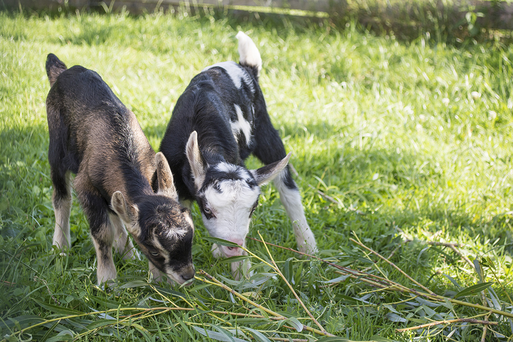 Unsere Ziege „Loisi“ mit ihren kleinen Zicklein, Katze „Mischa“ und Hase „Max“ freuen sich über viele Streicheleinheiten.